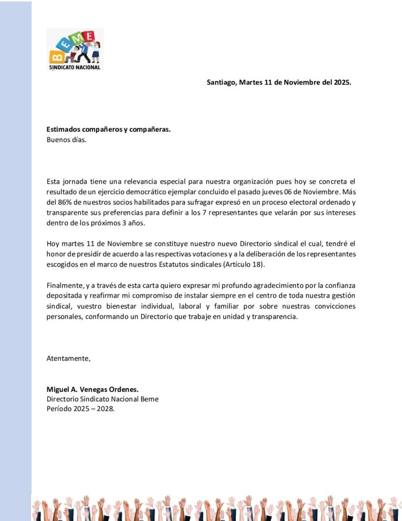 Carta de Miguel Angel Venegas Presidente Sindicato BancoEstado Microempresas, período 2025-2028 a nuestros socios con motivo de asunción en el cargo.