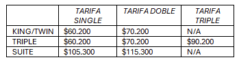 • Valor se mantiene para uno o dos pasajeros (habitación doble en cama matrimonial)